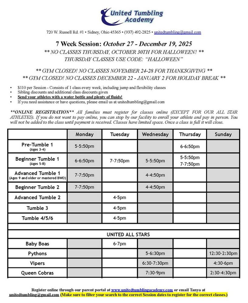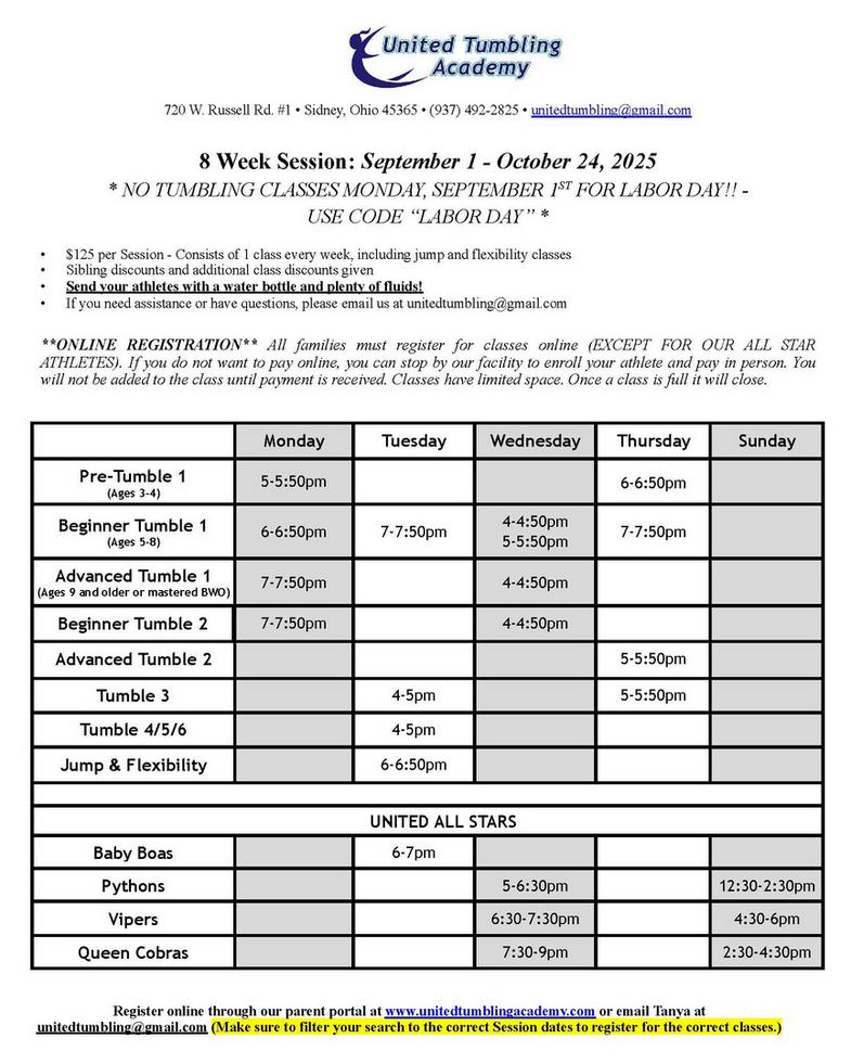 Tuition * $30 annual gym registration fee (tax included) * Tumbling Class Sessions vary depending on length of session * Parent-Tot Tumble is $11 per class. * Open gym is $5 per class for current athlete, $10 per class for non-current athlete * Multi-classdiscount available * Sibling discount for classes and sibling discount for our All-Star athletes! Classes Offered